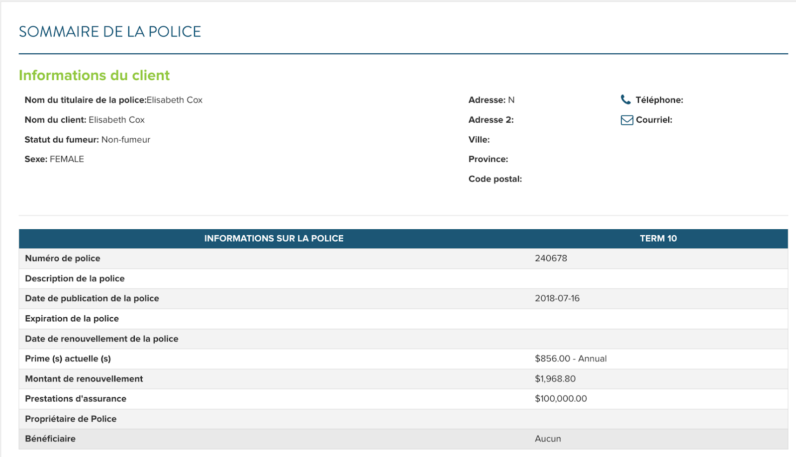 Les rapports récapitulatifs de police peuvent être générés en un clic depuis la page du profil du client. Ces rapports d’une page vous feront gagner du temps par rapport à la production manuelle de ces résumés, et offrent à vos clients un aperçu compact et professionnel de toutes leurs polices.